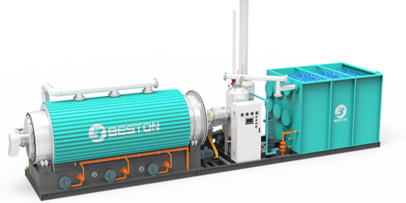 撬裝式廢輪胎煉油設備由除塵塔、汽包、減速機、裂解主爐、煙道冷凝器、引風機、三合一冷凝器等幾部分組成